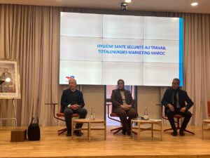 Badia JABRANE, Directrice pédagogique de l’Institut supérieur des sciences biologiques et paramédicales de l’université polytechnique Mohamed VI. Ses collaboratrices et ses collaborateurs. Nous avions un point quotidien lors des déjeuners durant les trois jours de cours. Lors de la plénière : une belle retrouvaille avec le directeur général de TotalEnergies Marketing Maroc.